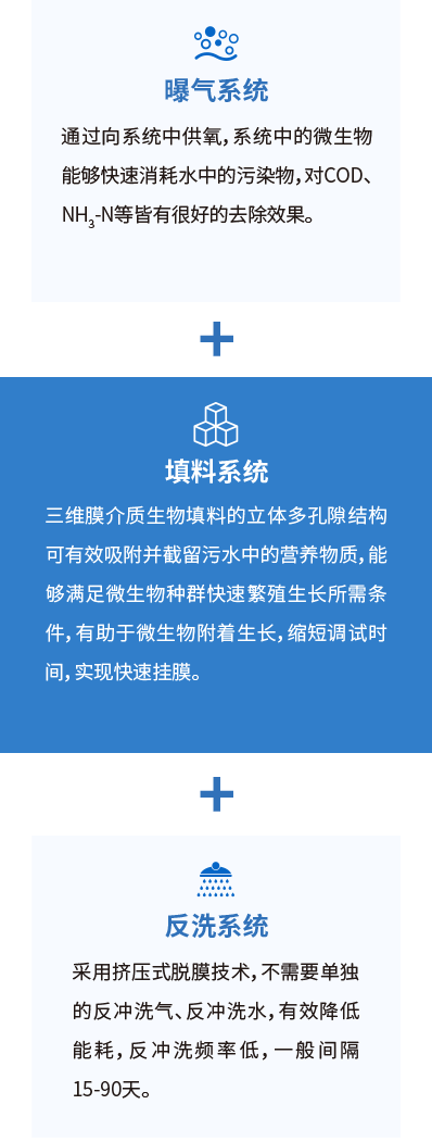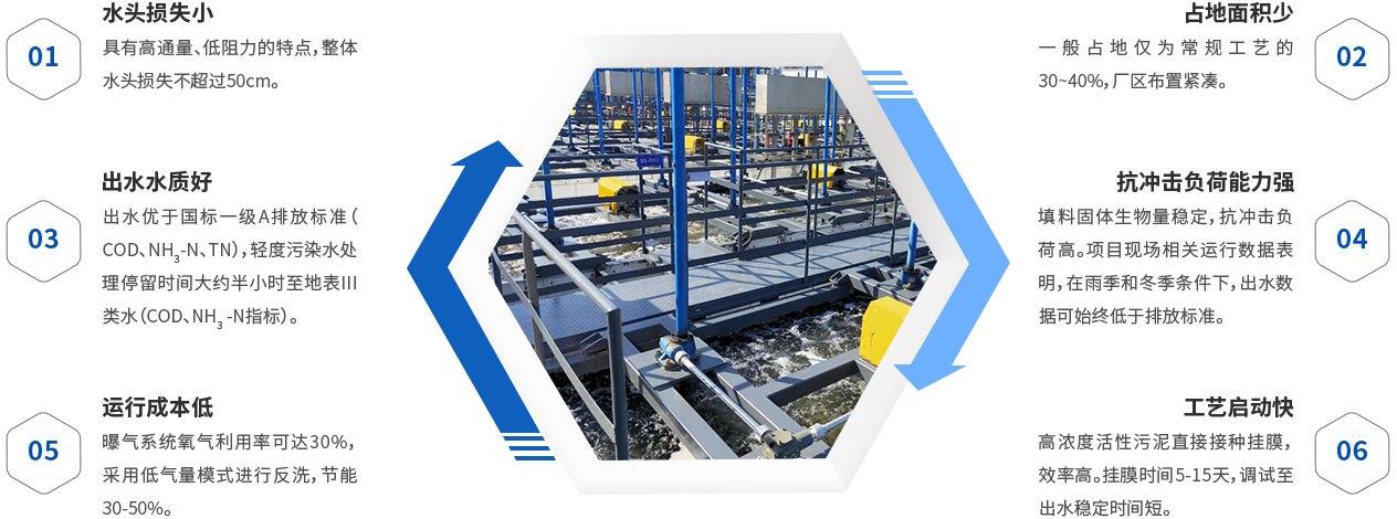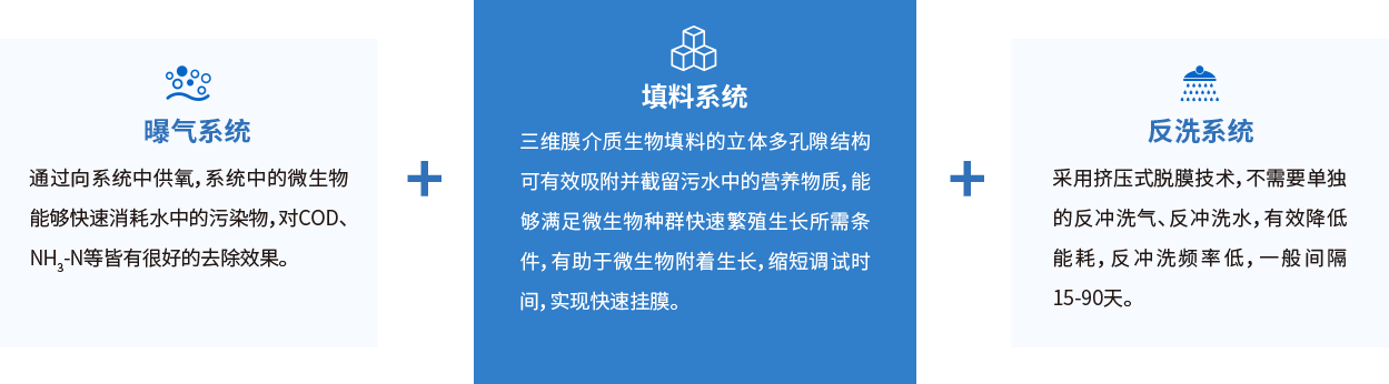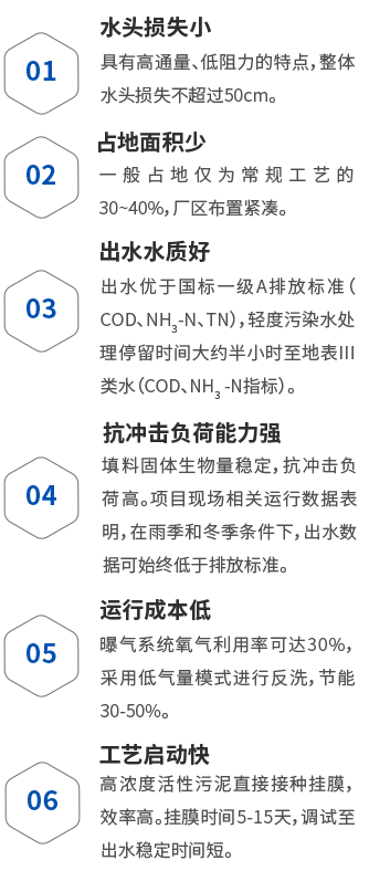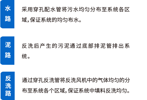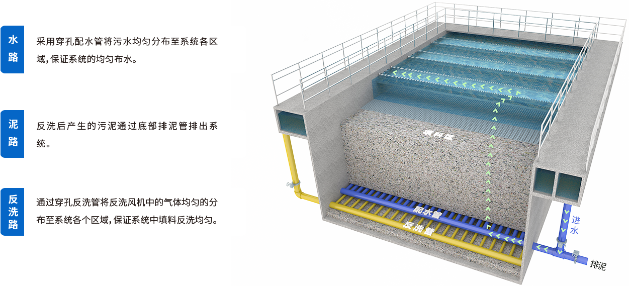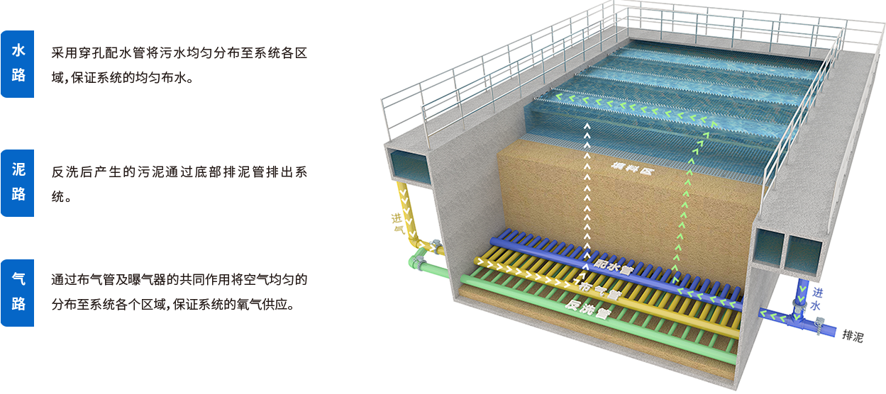 生物滤池是以去除可溶性污染物为目的的污水生物处理系统,系统采用特制填料做载体,通过无阻塞配水系统使污水进入反应池,随着系统的运行,微生物附着在填料表面上形成生物膜,污水与生物膜接触后,污染物被微生物吸收转化,以及填料的物理截留过滤作用,使得污水得到净化。