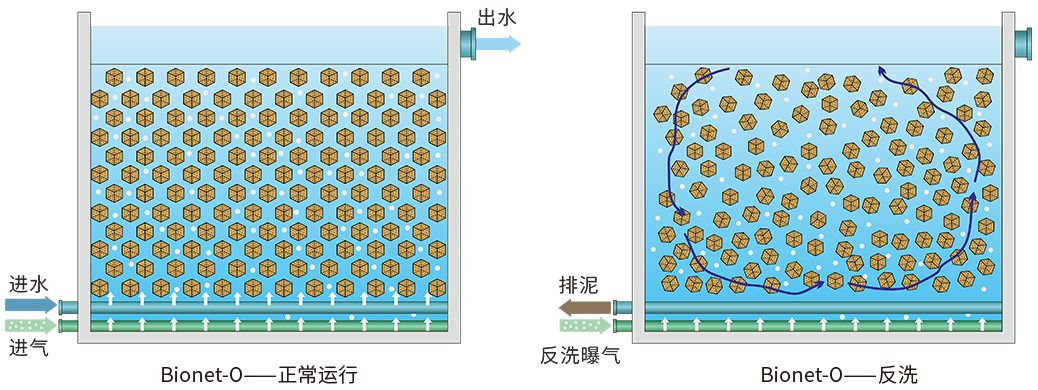 普氏环境自主研发的Bionet-O三维膜介质生物反应系统是一种改进型曝气生物滤池技术,其填料为三维立体弹性填料,机械韧性高,磨损率低,表面及内部粗糙,亲水性好,孔隙率超过95%,比表面积可达10000㎡/m³。三维立体弹性填料作为微生物的载体,为微生物的生长、繁殖提供保障,有利于微生物膜的附着、生长、不脱落,微生物能够快速消耗水中的污染物,对COD、NH3-N等皆有很好的去除效果。在硝化反应系统中,载体可起到切割、阻挡气泡的作用,增加气泡在水体中的停留时间和气、液接触表面积,提高传质效率。该技术入选安徽节能环保五个一百先进技术,已规模化应用于水质提升、水环境治理项目中。