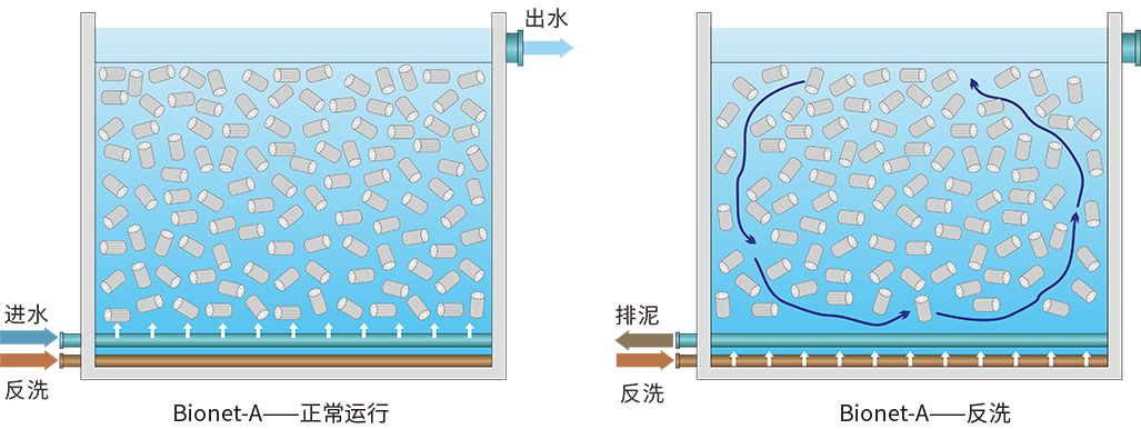 普氏环境自主研发的Bionet-A三维膜介质生物反应系统是一种改进型反硝化深床滤池技术,具有高效率的脱氮去除能力, 其填料采用高分子材料制成,机械强度高,耐摩擦碰撞以及水力剪切作用,磨损率低。该填料开放式中空设计,有效孔隙率超过80%,运行时无需流化,有利于世代较长的微生物的富集和生长。填料密度0.95g/cm³,接近于水,挂膜后能很好的悬浮水体中,不会沉底和漂浮。该填料系统将过滤、生物吸附、生物氧化为一体,单位体积污水处理效率高。上向流设计,不易堵塞,缺氧环境好,不需单独的驱氮设备。