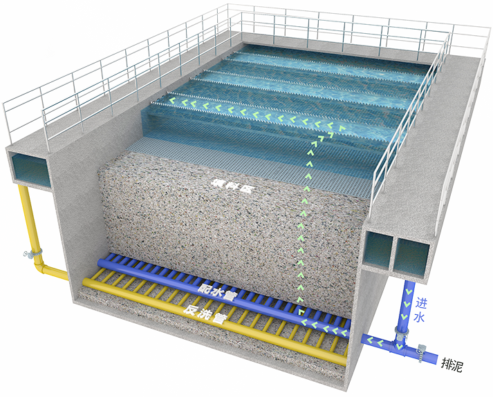 反硝化深床滤池是一种采用特殊规格及形状的石英砂作为反硝化生物的挂膜介质,通过生物脱氮和过滤作用去除污水中硝酸氨及悬浮物的构筑物。