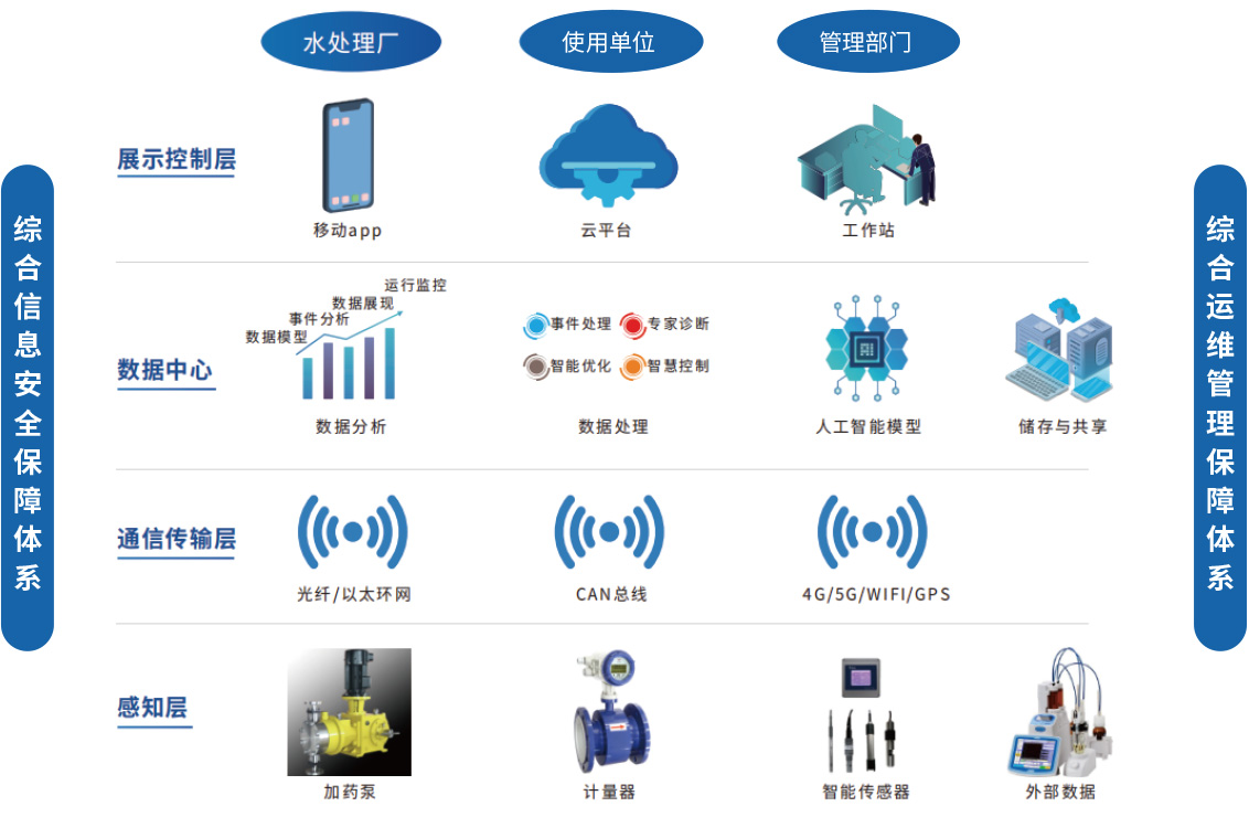 基于“感、传、知、用”四层架构,采用软硬件组态来实现整个处理过程的智能化控制,服务于各类水处理厂/站、回用水使用单位和管理部门,为出水水质持续稳定、安全生产及智能化管理提供有力的保障。依托移动互联网、大数据分析、人工智能、水质分析等技术,对各环节的工艺参数进行控制,通过对水处理全过程的智能控制,实现节能降耗、减员增效的目的。